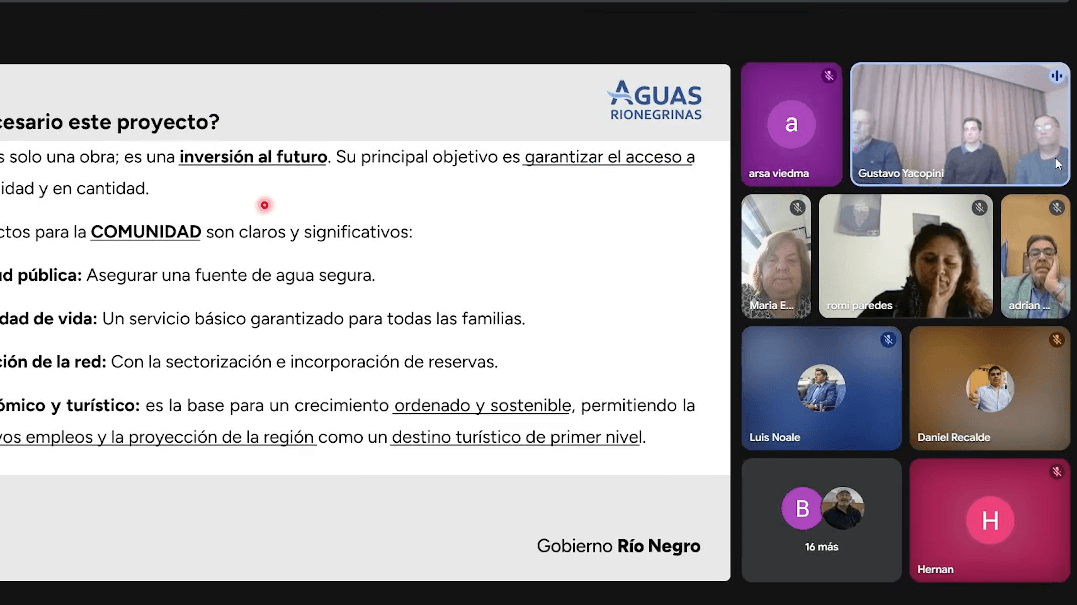 Aguas Rionegrinas llevó adelante con éxito la consulta pública del Plan Director de Agua Potable para San Antonio Oeste y Las Grutas, una instancia que se concretó a través de una reunión virtual en la que participaron la intendencia local, referentes del municipio, legisladores, integrantes de juntas vecinales y vecinos de la comunidad.
